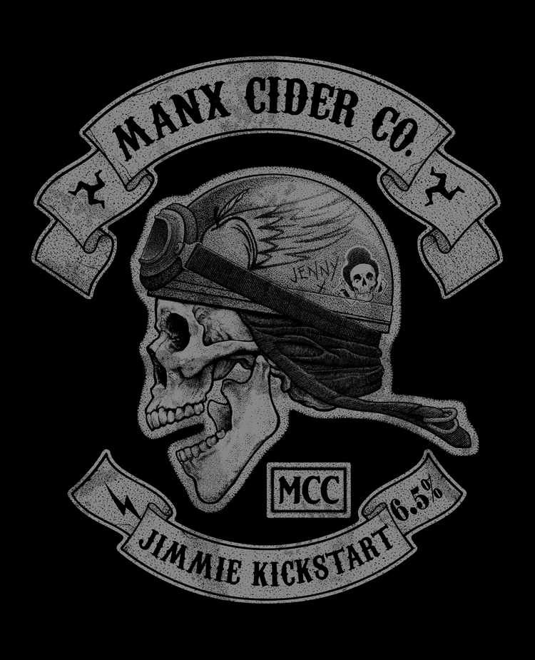 Specialising in proper cider, not the “commercial fizzy garbage” Manx Cider Co. wanted their brand to reflect this as well as giving a nod to the TT and classic motorcycle stylings. Originally starting with a top hatted skull, the idea and look was expanded upon for the range of other ciders that were produced in the following years.